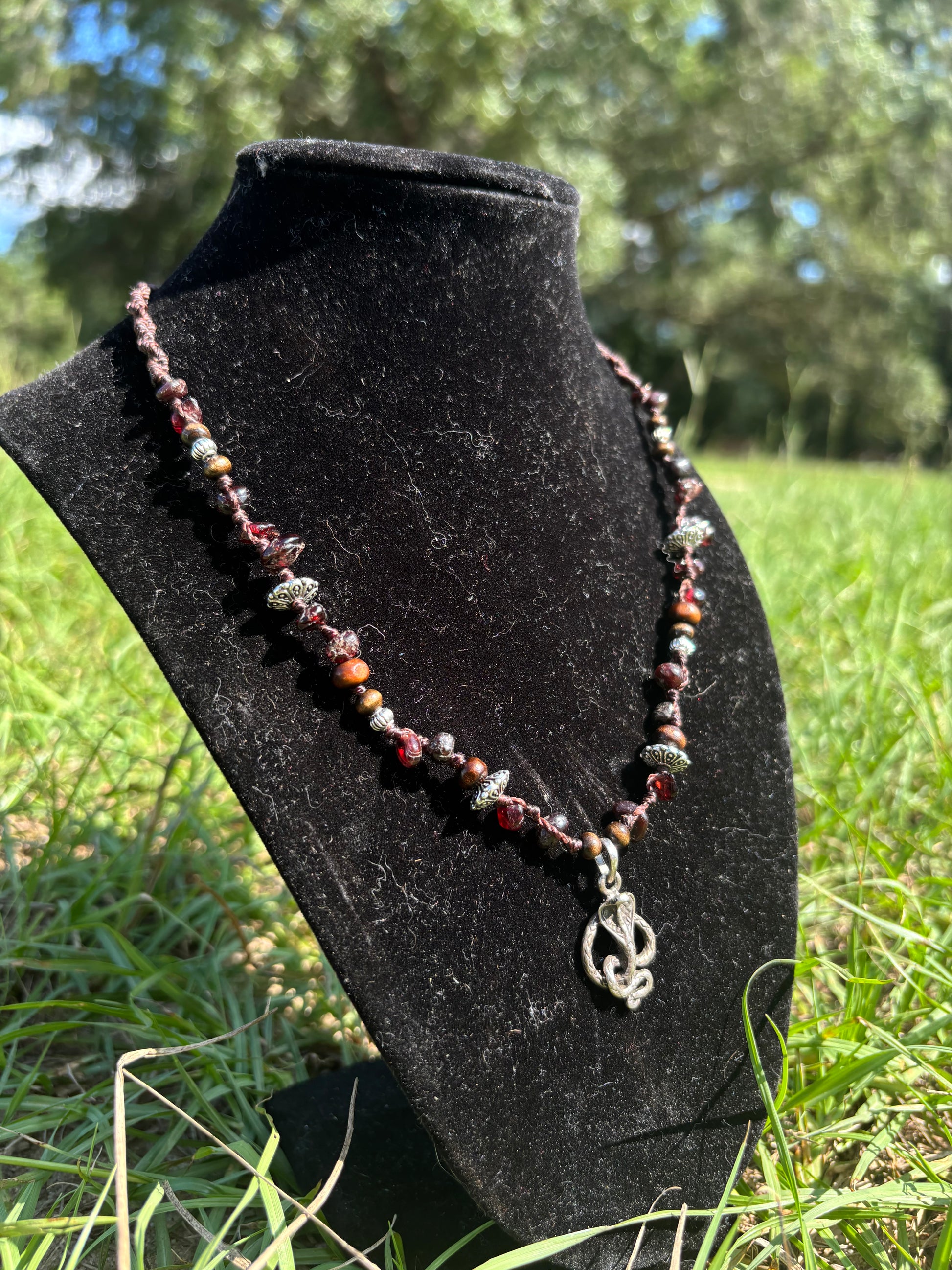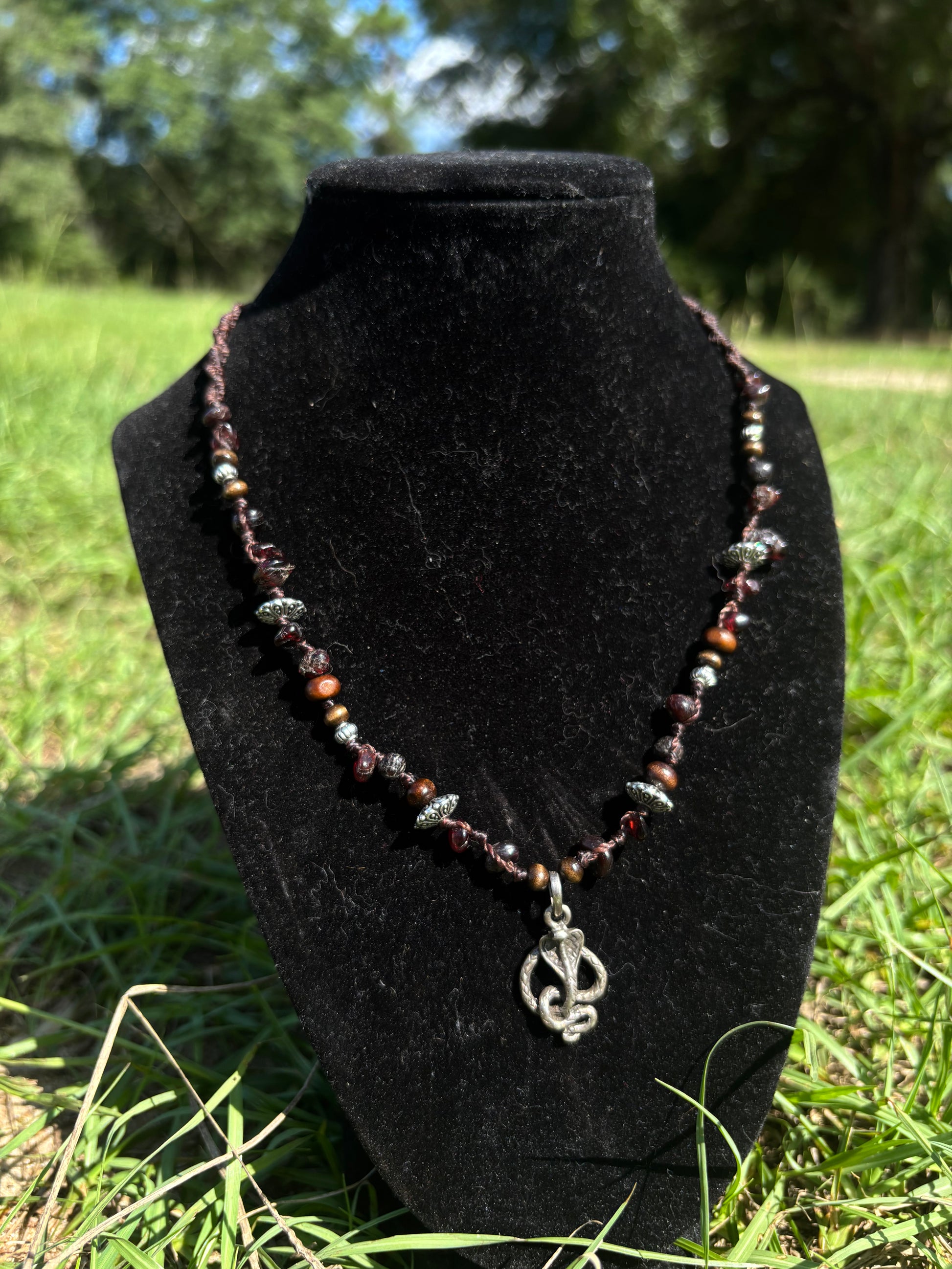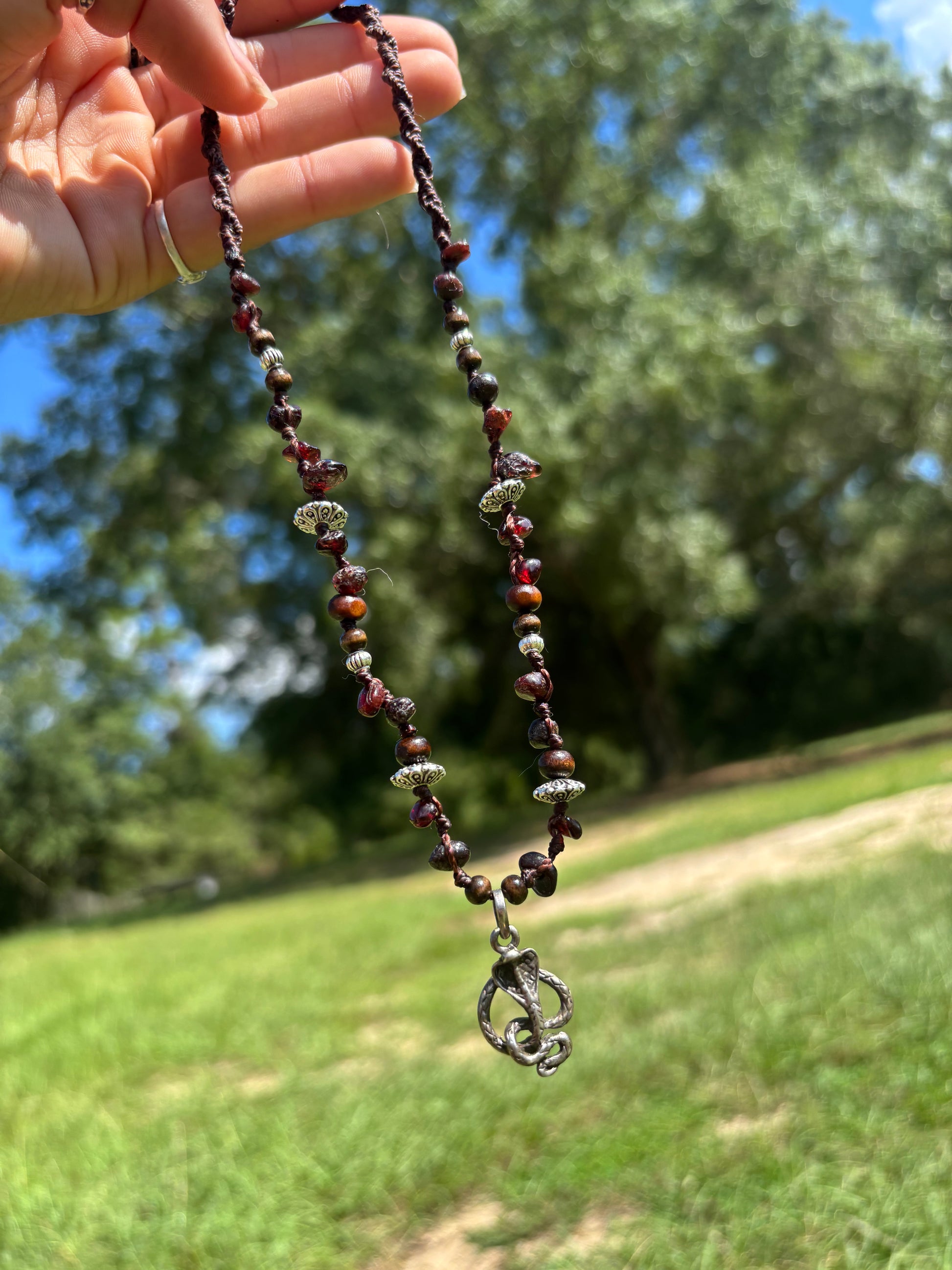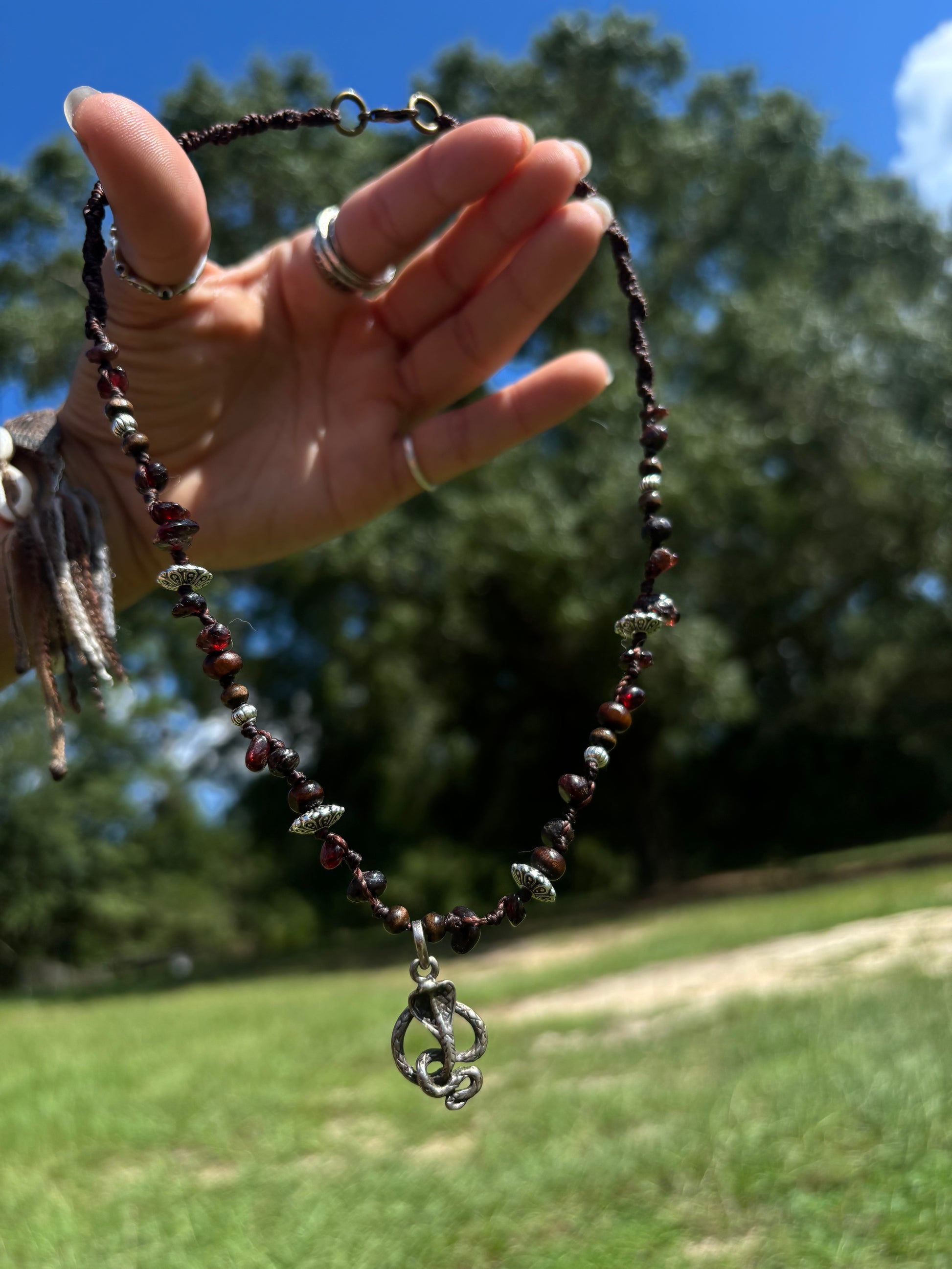 Snake pendant necklace made with rough garnet beads, wooden & silver accents.