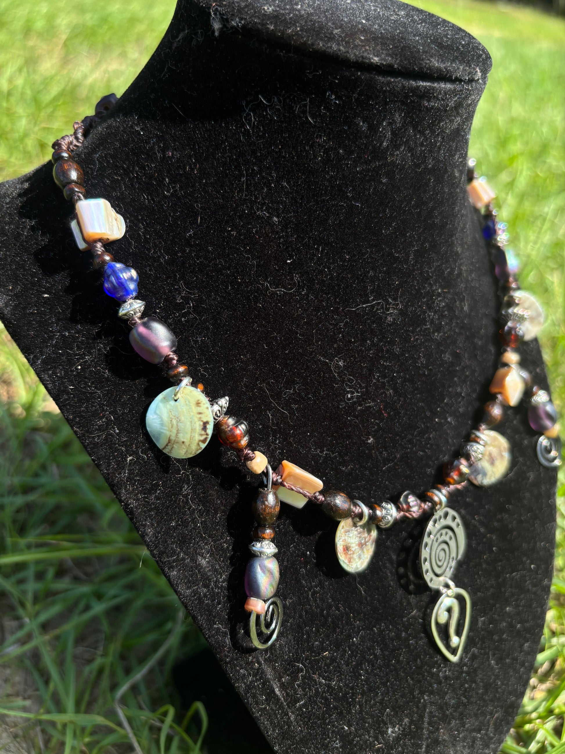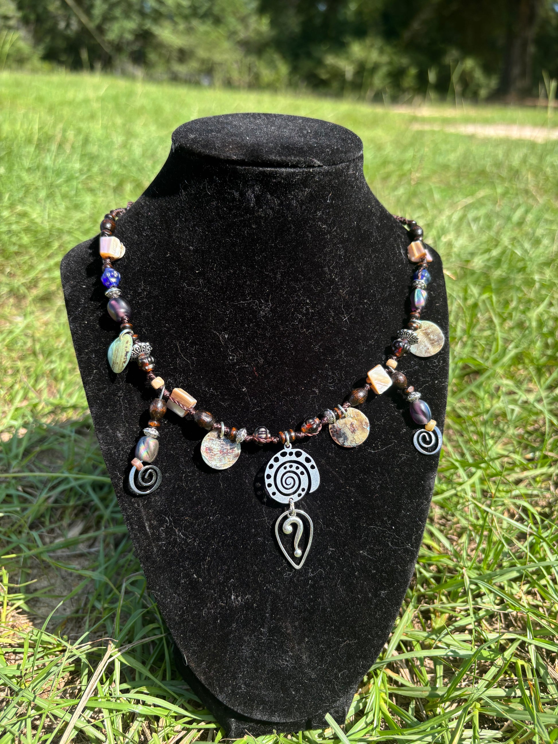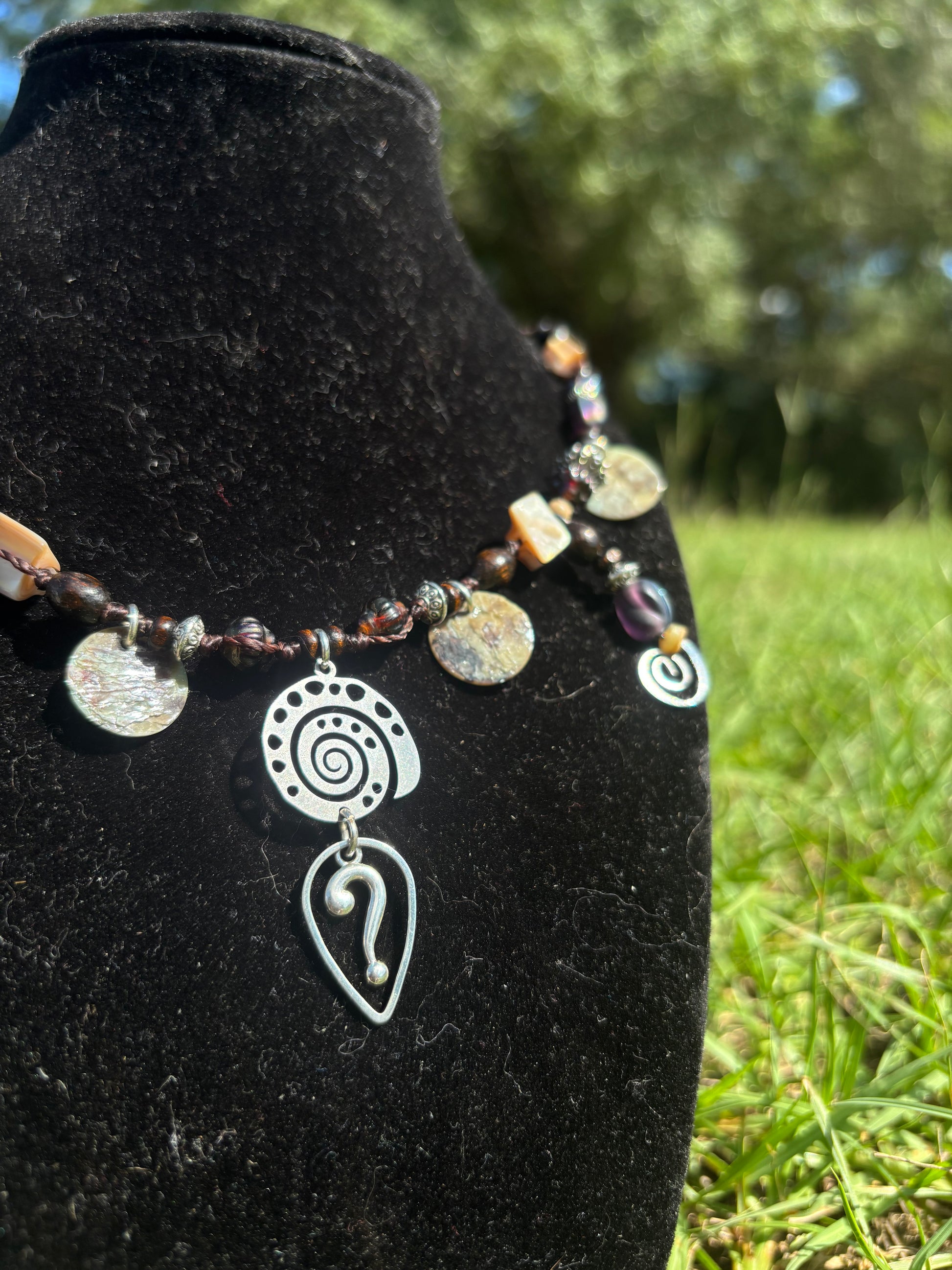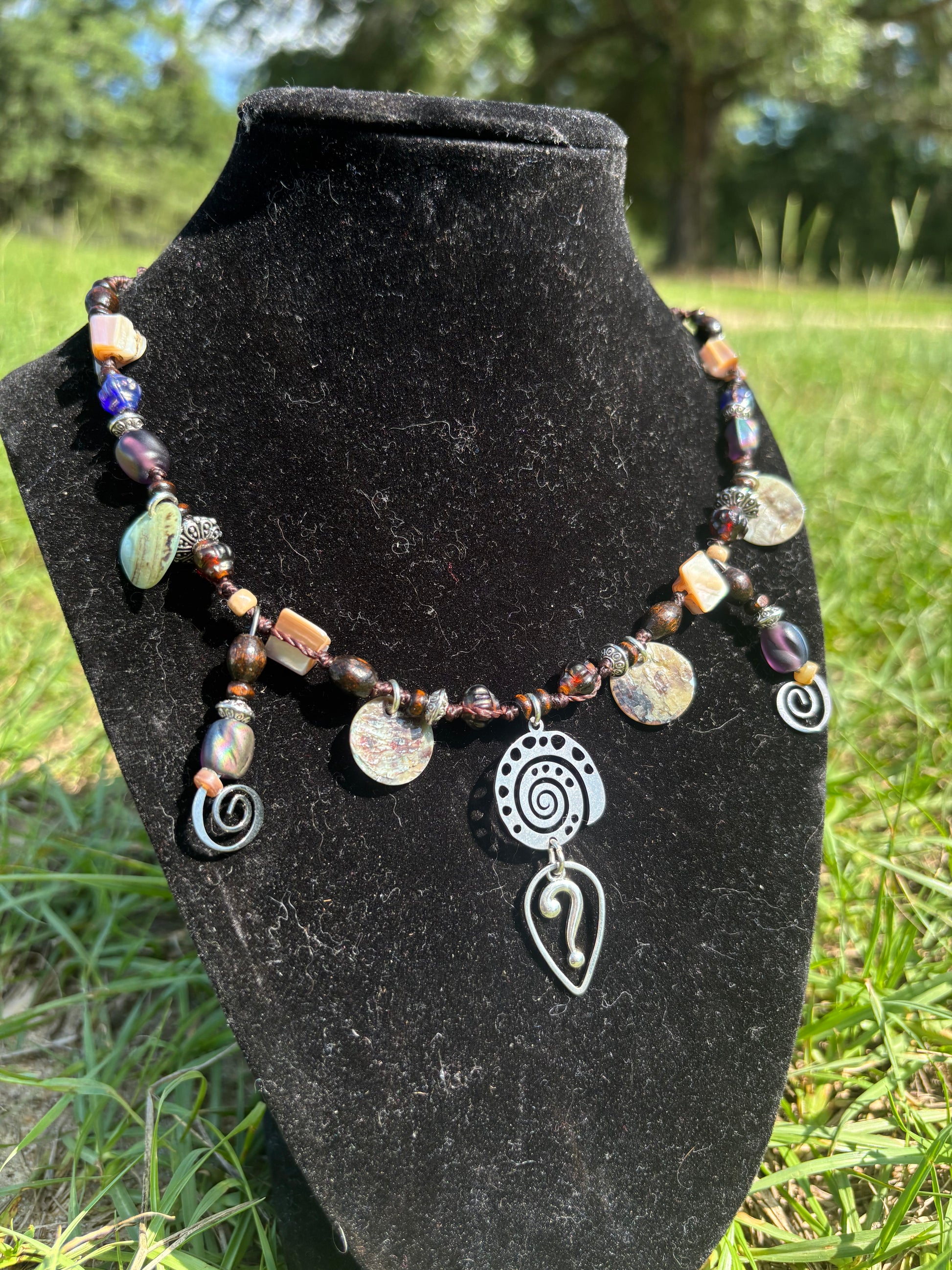 Tipper pendant necklace with different types of shell, wooden, glass & silver beads. Spiral goddess <3