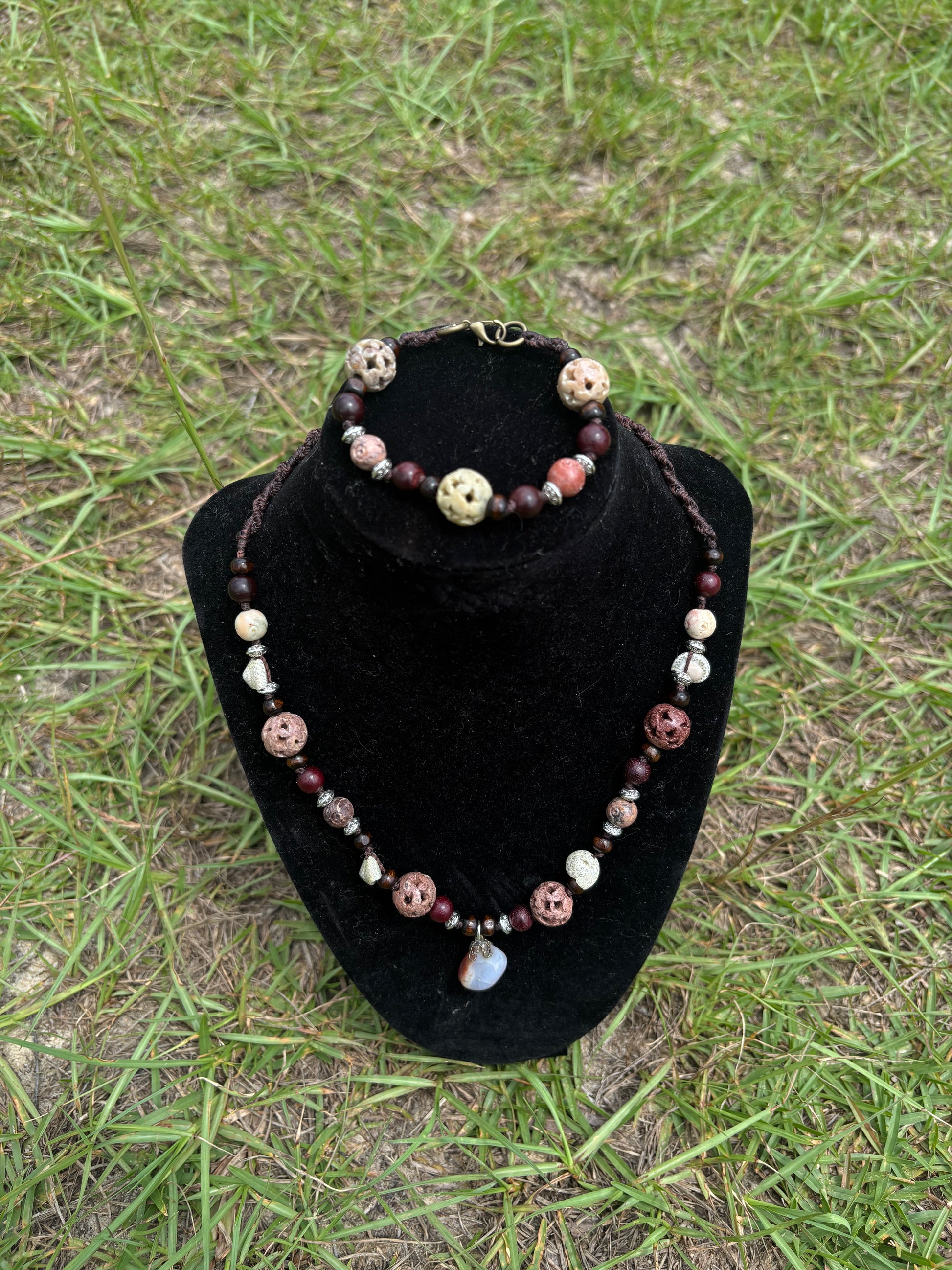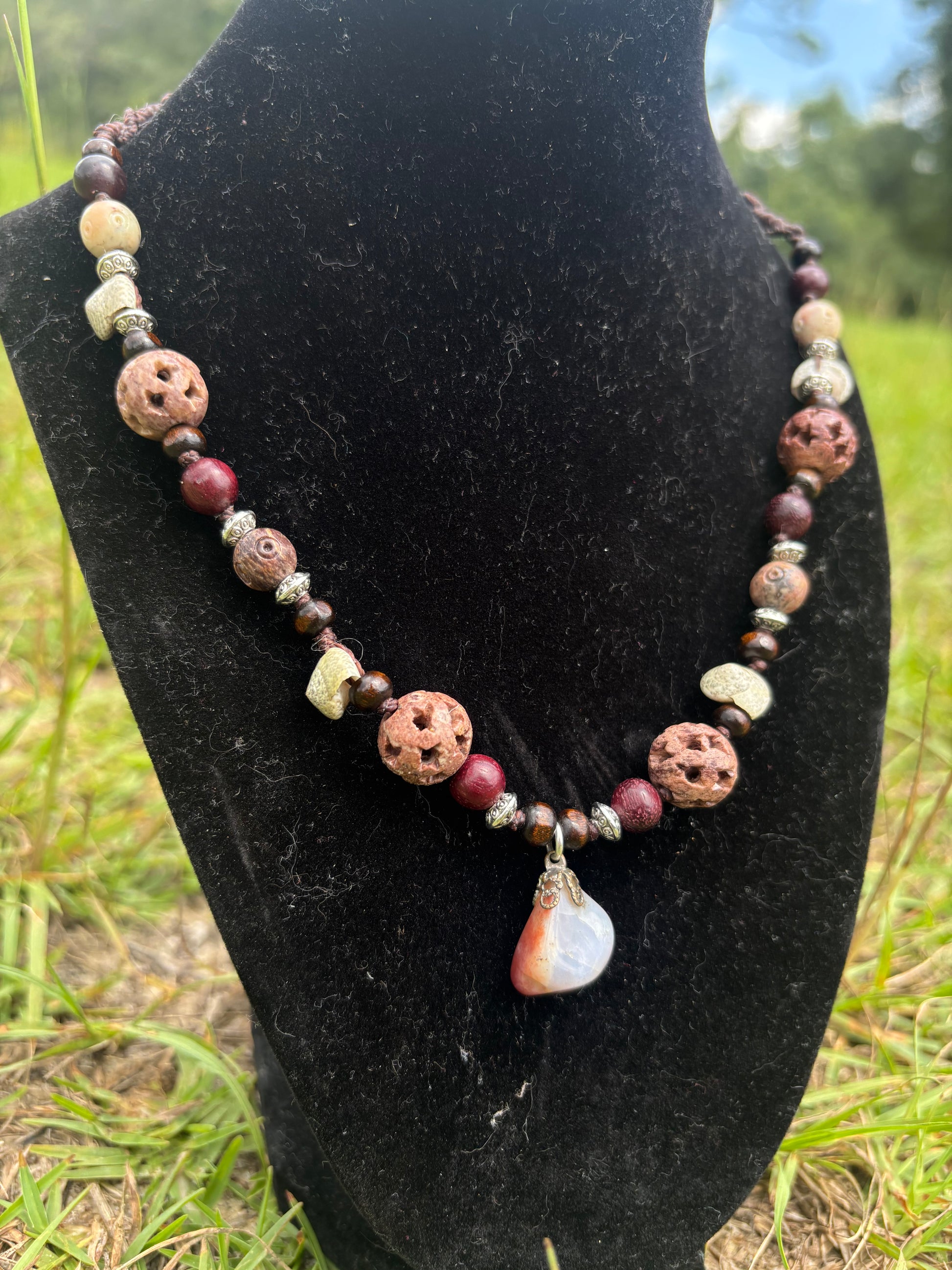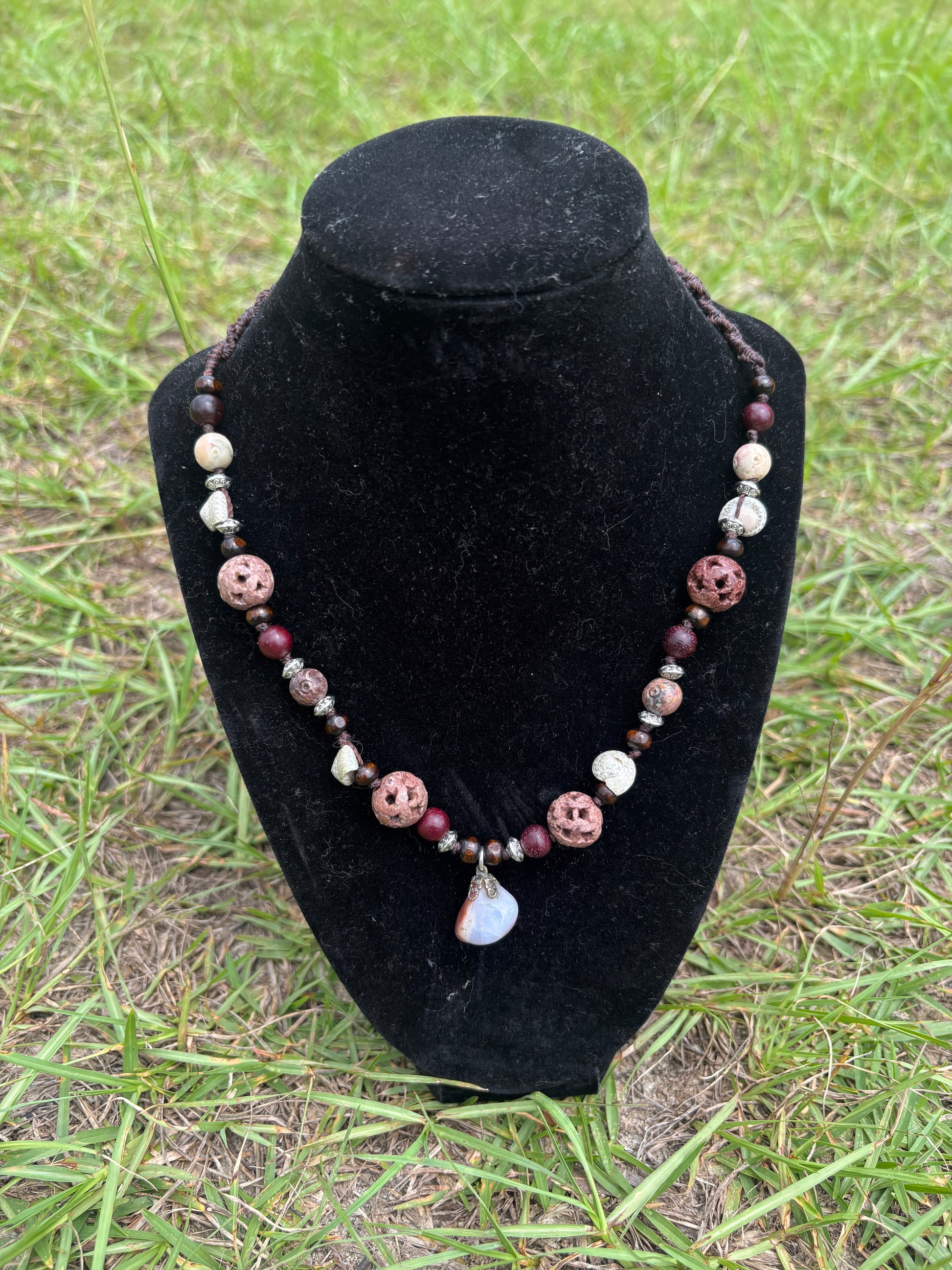 Carved stone, shell, wooden beads with stone pendant. DOES NOT COME WITH BRACELET. Matching bracelet will be under the “bracelets” collection.