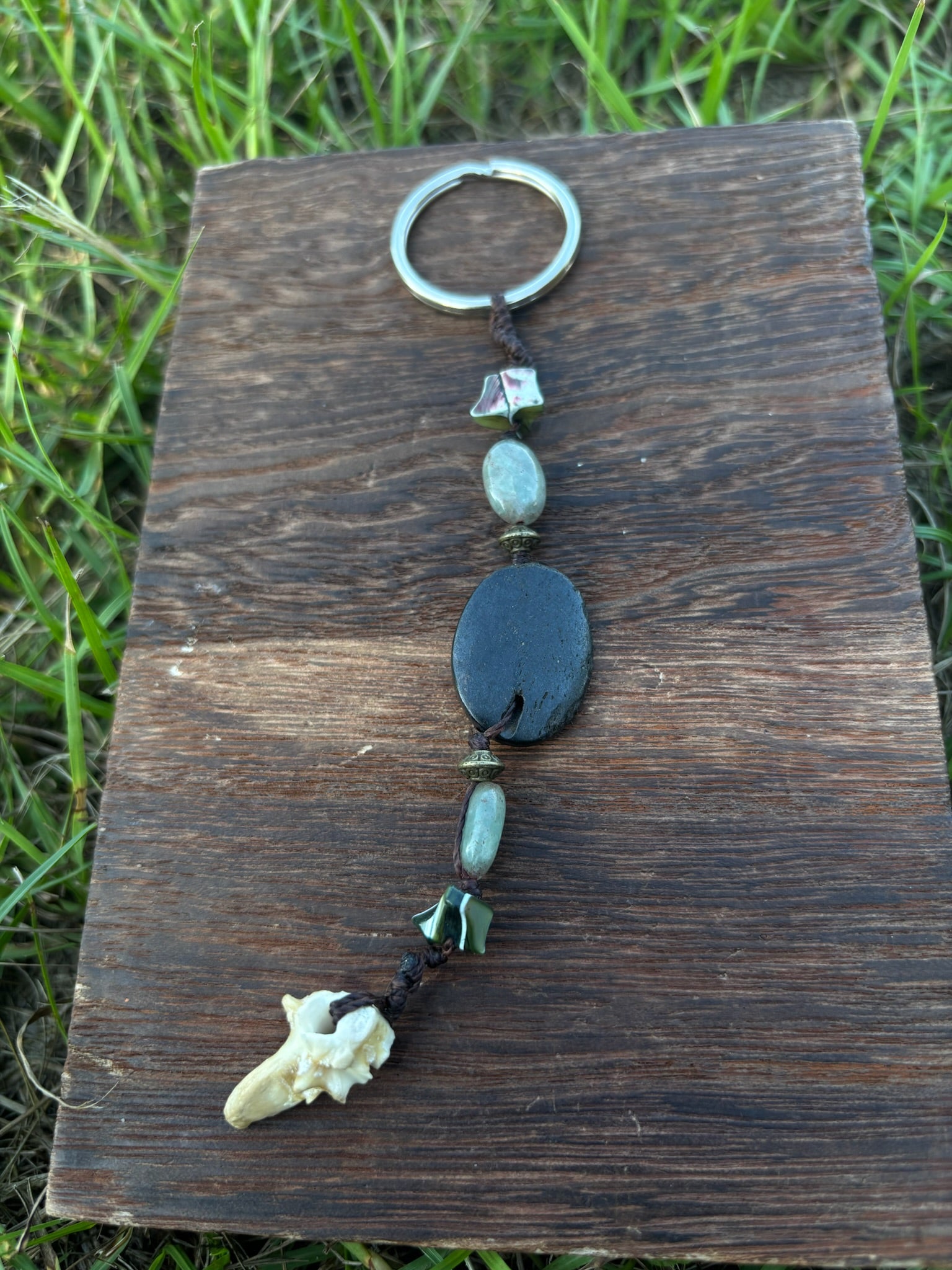 Opossum vertebrate, bone, shell & blue/green gemstone.