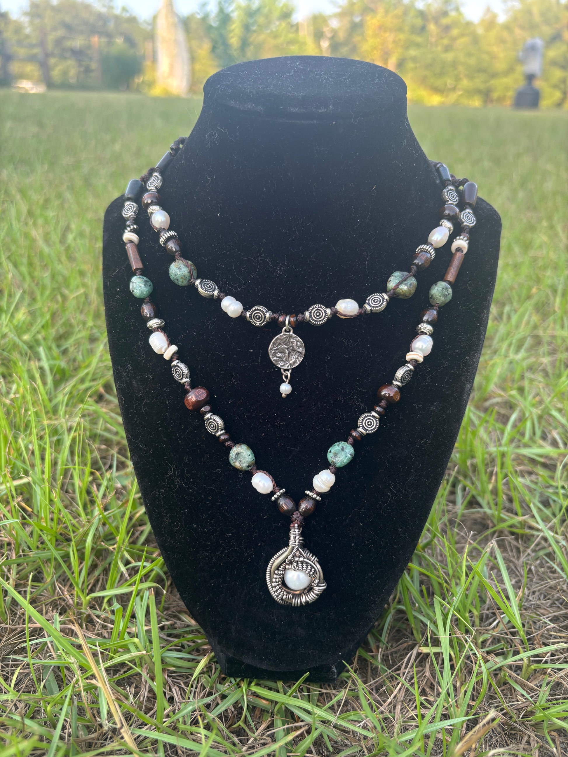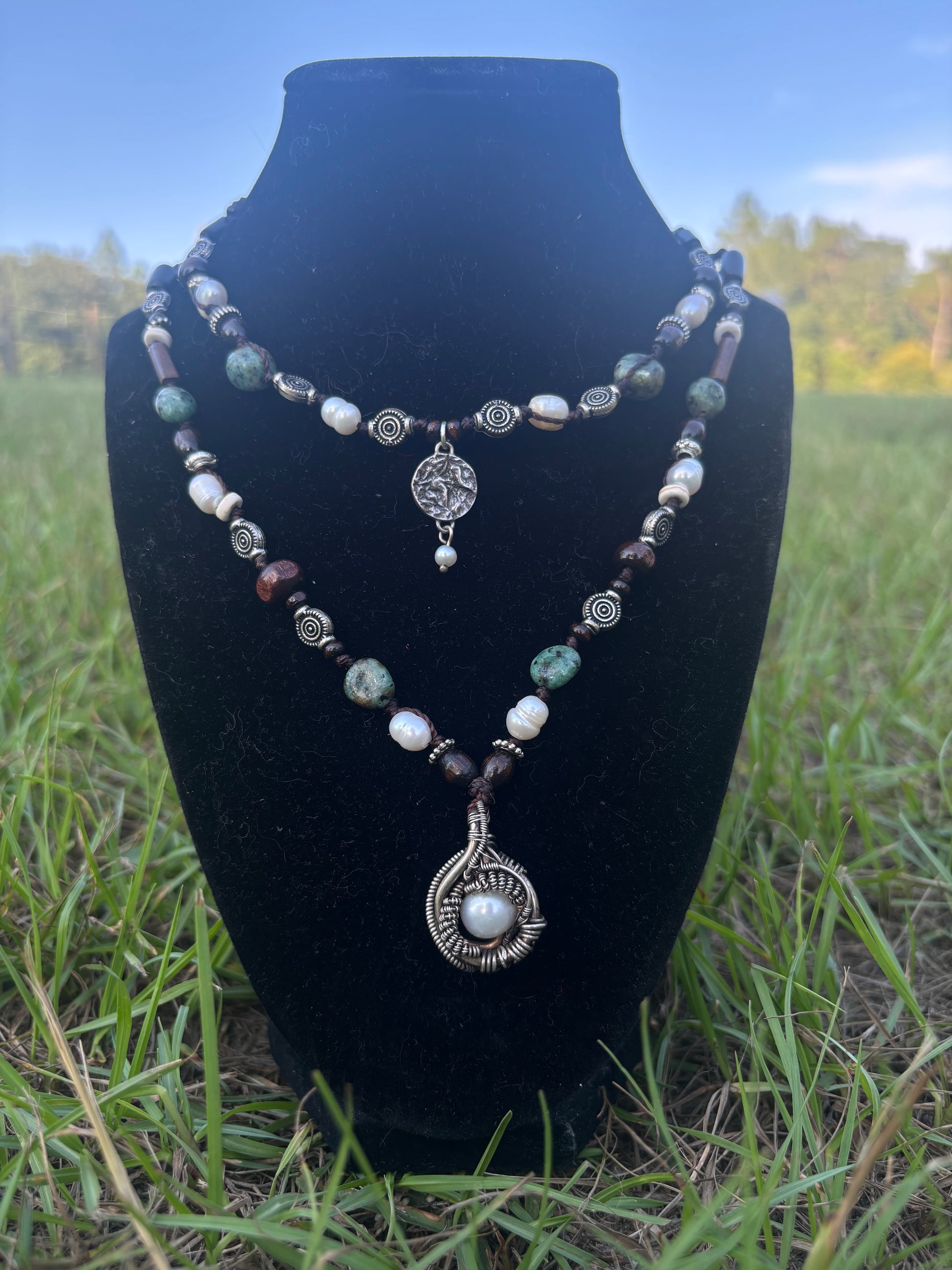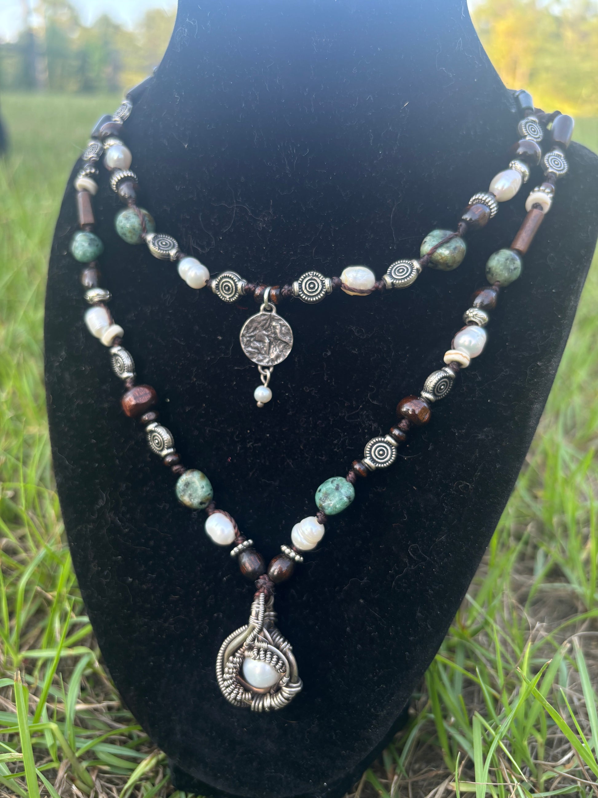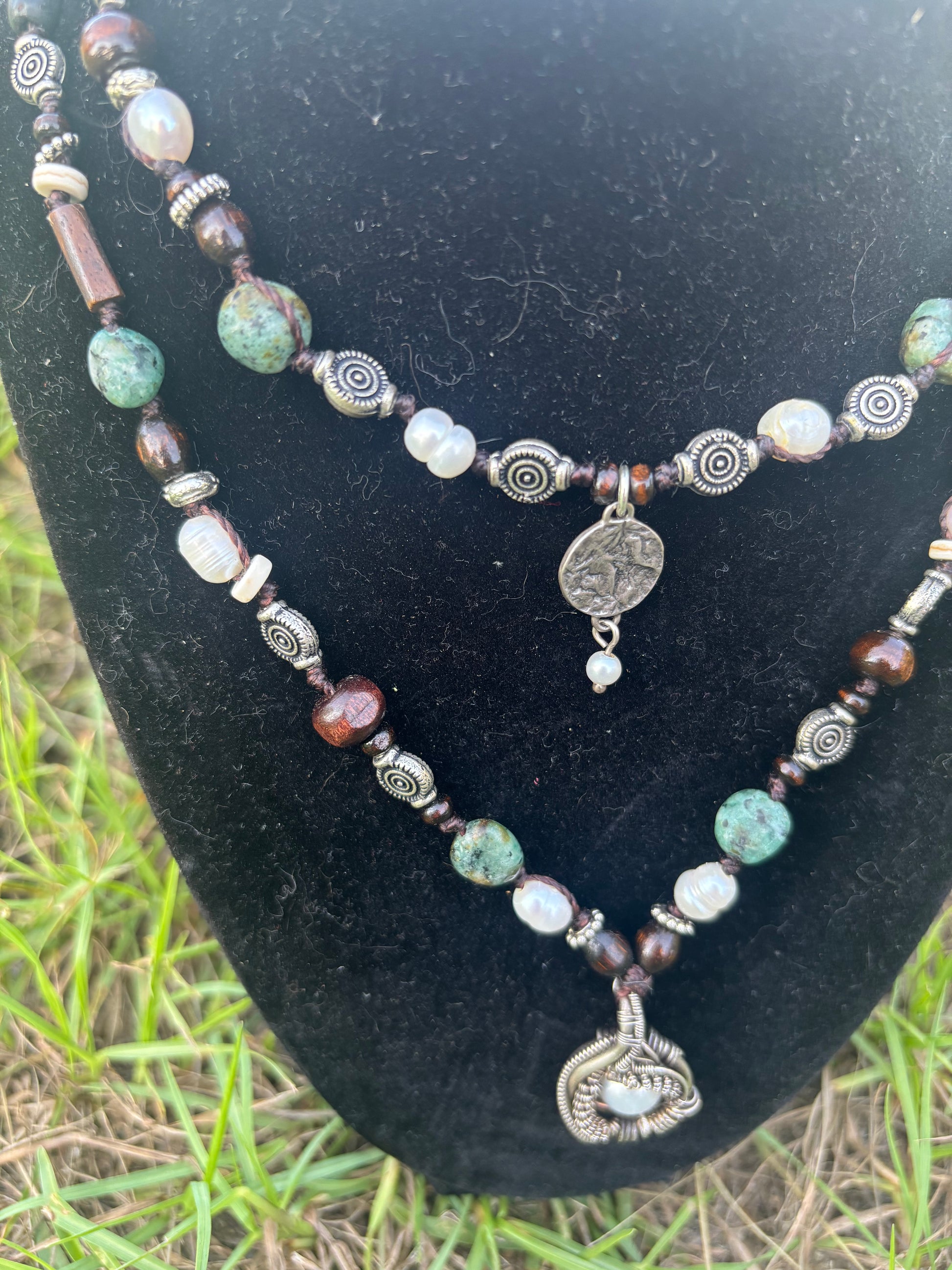 a beautiful collab with Brandon Ketabi @universal__synergy (wire wrapped pendant). pearls & blue-green gemstones.